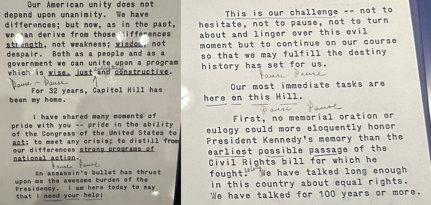 My interest in this last category is more than just the passing interest of a citizen. It’s fascinating to see how technology has changed speeches, even for Presidents, and also how the important things they needed to remember had little to do with the words and phrases. For instance, in Lyndon B. Johnson’s inaugural address, given just after JFK’s assassination, he wrote several times (in his own handwriting) “Pause – Pause” between paragraphs. George Bush wanted to emphasize specific words to indict Sadaam Hussein in his 9-11 speech to the country.